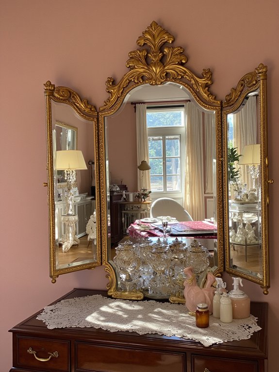 The mirrors serve both practical and aesthetic purposes, combining authentic period craftsmanship with functional features like multiple viewing angles and tilting mechanisms. From detailed scrollwork to hand-carved frames, these statement pieces maintain historical accuracy while providing essential reflection for daily grooming routines.