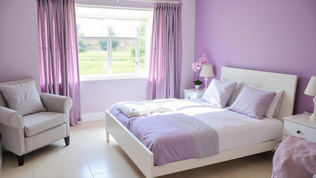 While blue tones bring serenity, let’s shift to the gentle charm of calming lavender shades for your bedroom. These soft purple hues create a peaceful vibe, perfect for unwinding after a long day. You can paint your walls in a light lavender tone, covering a 10×12-foot room in about 4 hours.