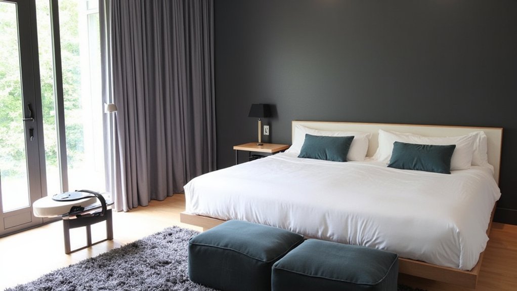 While softer tones bring warmth, you can create a striking contrast in your bedroom with bold charcoal accents. This deep, dramatic shade adds sophistication when used right. Paint an accent wall—about 10 feet wide—with charcoal gray in matte finish for understated elegance. Balance it with light bedding to avoid a heavy feel.