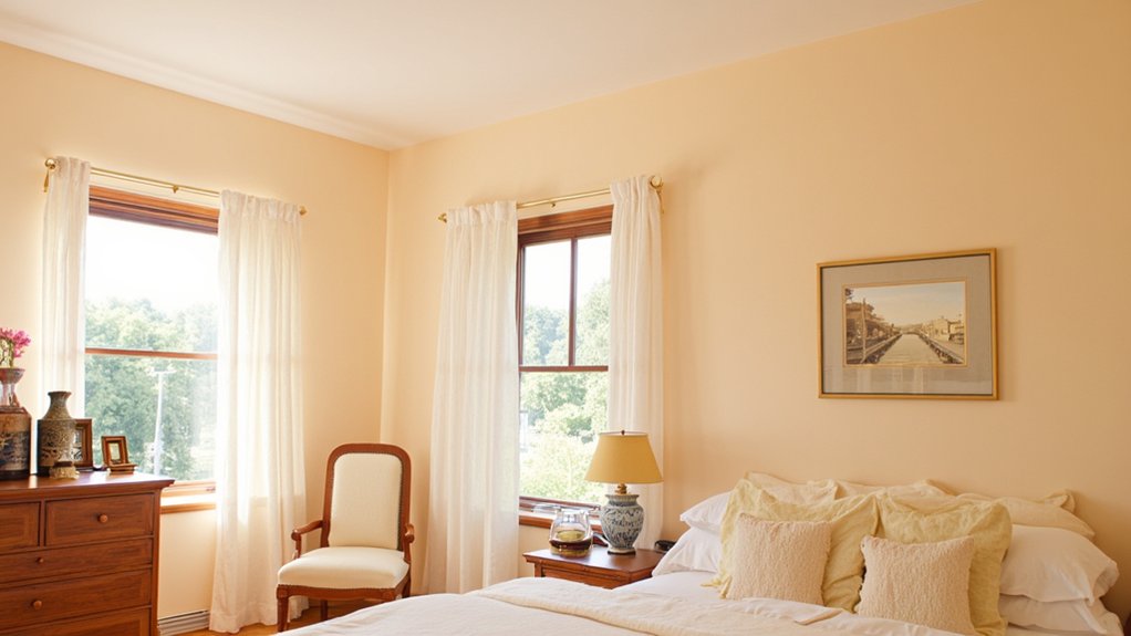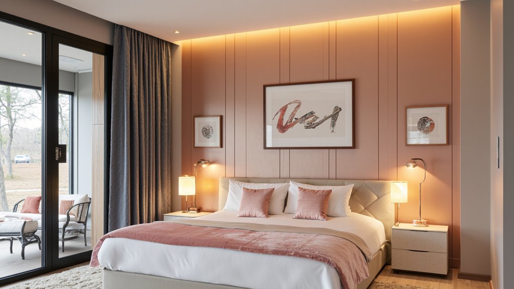Shift your bedroom’s vibe to a luxurious escape with the warm, sophisticated glow of elegant rose gold. You’ll transform your space into a haven by pairing this trendy shade with soft creams or deep grays. Paint an accent wall, about 10×12 feet, in a matte rose gold finish for a subtle shimmer.