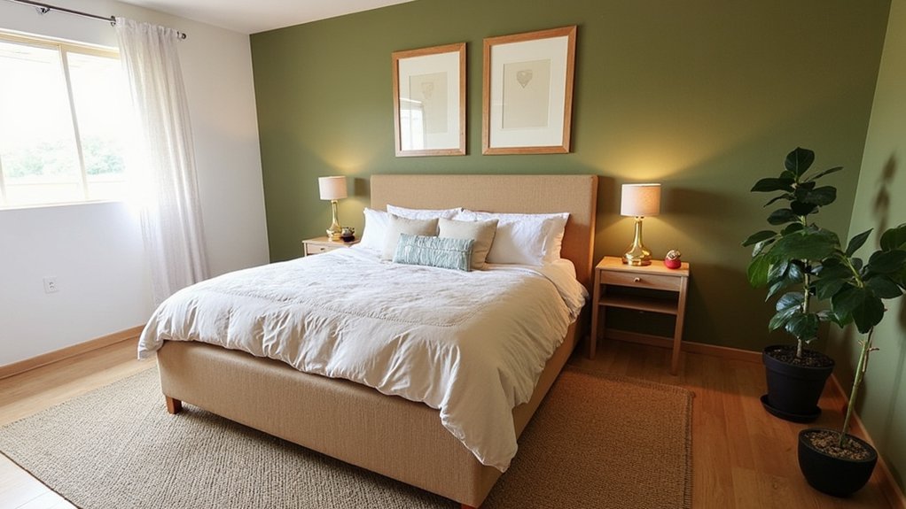 Bring a grounding vibe to your bedroom by embracing the rich, natural charm of earthy olive tones. You can transform your space into a calming retreat with this versatile hue. Start painting an accent wall (about 10×12 feet) over a weekend for a quick update.
