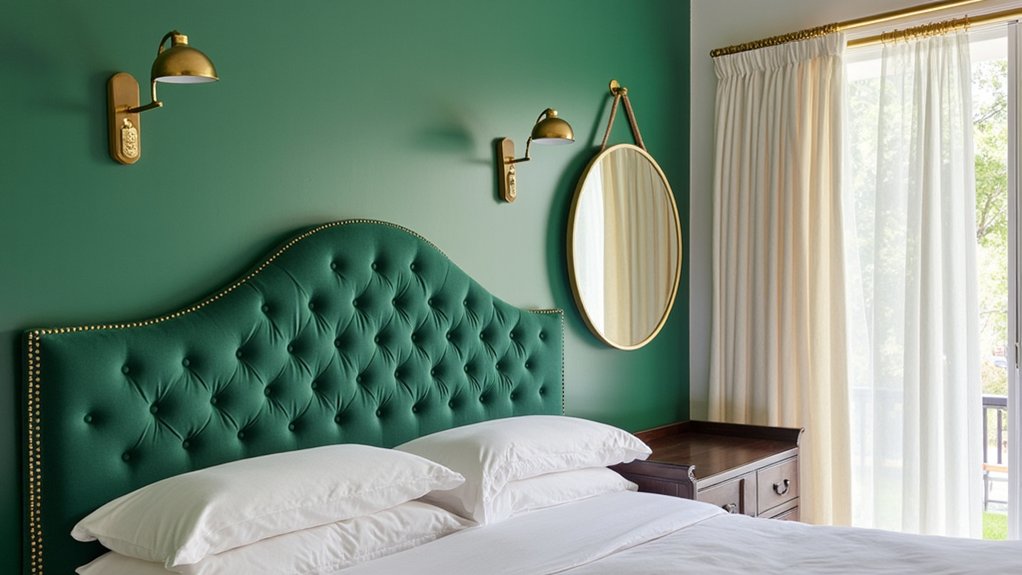 Moving on from the earthy charm of terracotta, plunge into the lush sophistication of vibrant emerald green for your bedroom. This bold shade brings a calming yet regal vibe, perfect for relaxation after a long day. Paint your walls with a matte finish for a 12×10-foot room, taking about 4 hours.