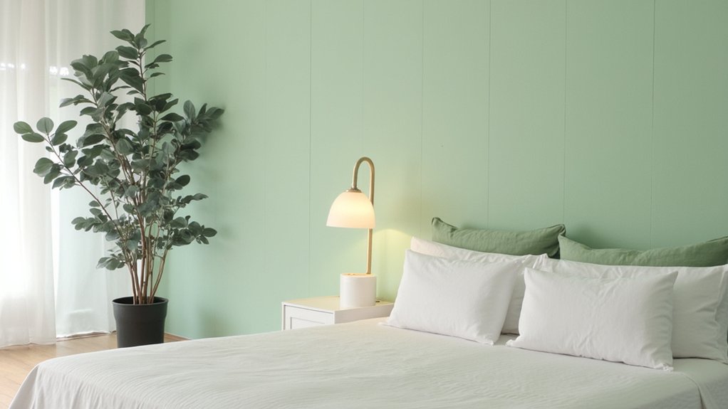 Let’s shift gears from the intense vibes of charcoal to a calmer, invigorating hue with serene mint green. You’ll love how this soft, pastel shade transforms your bedroom into a peaceful retreat. Paint your walls with a matte finish for a soothing effect, covering about 400 square feet with two coats.