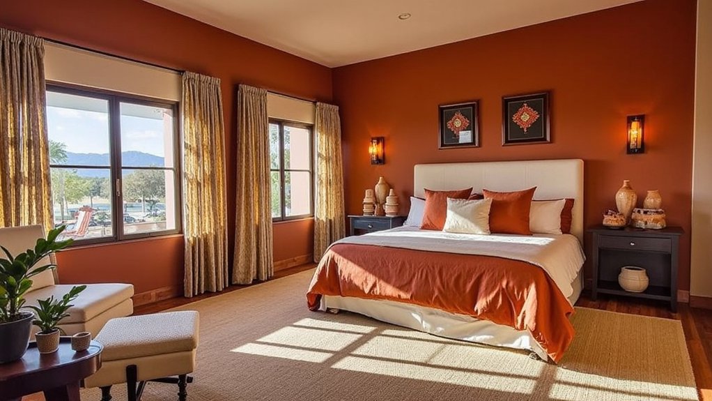 Let’s shift focus from the soothing lavender tones to the inviting warmth of terracotta hues in your bedroom. These earthy shades, reminiscent of sun-baked clay, can transform your space into a cozy retreat. Paint your walls with a terracotta base, aiming for a 10×12-foot room coverage in two coats, taking about 4 hours.
