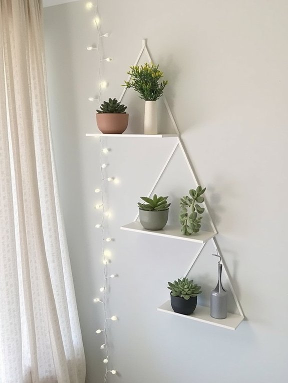 A minimalist succulent corner display combines natural beauty with contemporary design principles, featuring carefully selected succulents arranged on a floating shelf. The simple yet impactful setup uses 3-5 plants of different heights and textures, housed in clean-lined white or concrete planters.