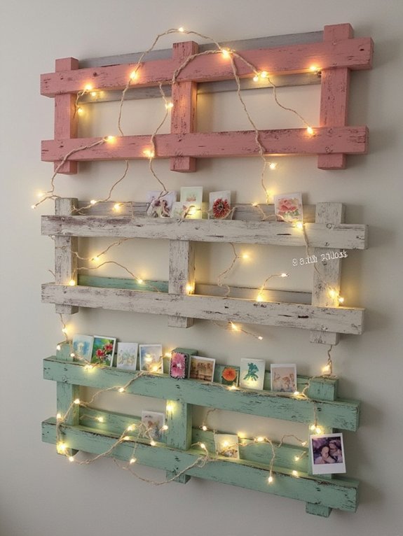 The project requires mounting the pallet horizontally with proper wall anchors, adding wire or twine for easy artwork display, and painting individual slats in coordinating colors. Optional LED lights between boards create soft ambient lighting, turning a simple shipping material into a personalized artistic focal point that combines rustic charm with modern style.