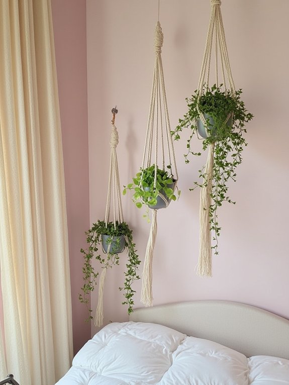 The installation requires secure ceiling hooks placed 12 inches apart to support multiple hanging plants. Macramé hangers ranging from 24-48 inches create visual depth, while low-maintenance plants like pothos and spider plants thrive in these suspended planters. Positioning each plant 6-8 inches below light sources ensures optimal growth conditions while maintaining aesthetic appeal.