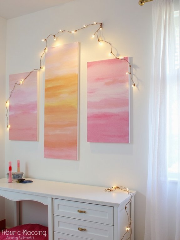A watercolor sunrise wall display transforms a bedroom wall into an artistic centerpiece using large-scale painted scenes of dawn. By blending warm oranges, pinks, and purples on watercolor paper, this DIY project creates a soft, atmospheric gradient that captures the tranquil moments of daybreak.