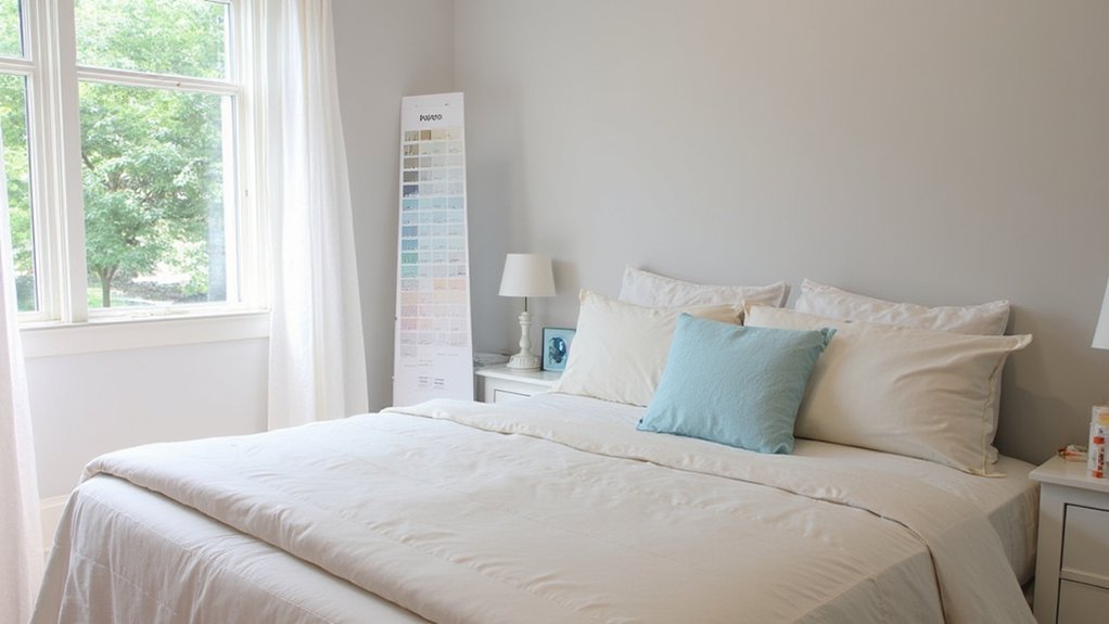 While lighting sets the mood, your bedroom’s color scheme can truly define its personality and comfort. You’ve gotta pick hues that calm you, so let’s explore creating harmony with colors.