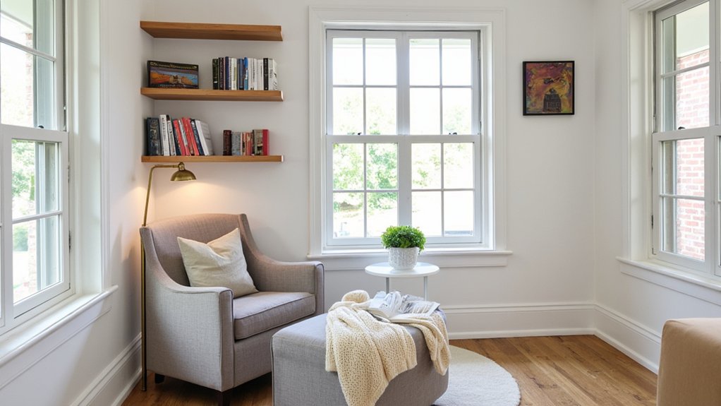 As you transform your bedroom into a relaxing haven, consider carving out a cozy reading nook for quiet moments. Choose a corner near a window for natural light, ideally 3×3 feet of space. Add comfort and style with these steps over a weekend: