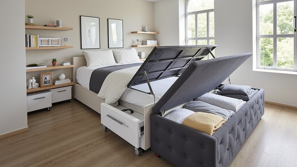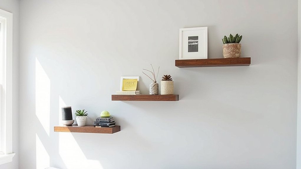 Innovative wall-mounted shelves can transform your bedroom by adding storage without eating up floor space. You’re maximizing vertical areas, so install shelves about 5 feet high for easy reach. Use sturdy brackets to hold up to 50 pounds per shelf, ensuring durability.