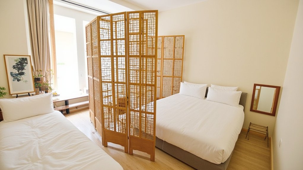 Before you finalize your bedroom setup, consider adding versatile room dividers to create distinct zones in your space. They’re perfect for separating a sleeping area from a small workspace in a 10×12-foot room. Install them in under an hour with minimal tools.