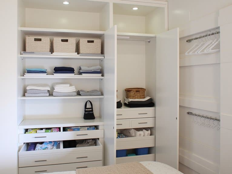 Consider installing adjustable shelves to customize storage heights and incorporate decorative bins for concealing personal items.