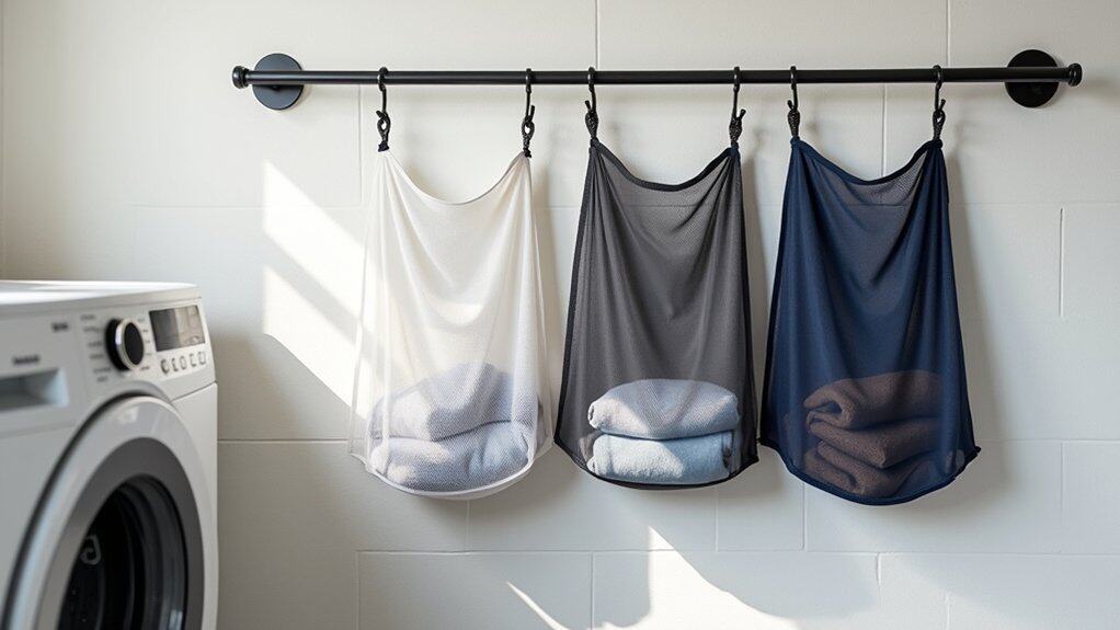 Hanging laundry bags are an excellent solution for keeping your basement laundry room tidy and efficient, especially in tight spaces. These bags can be mounted on walls, doors, or even the side of a washer or dryer to save floor space. Opt for durable, breathable mesh bags to prevent odor buildup and guarantee visibility of contents for easy sorting.