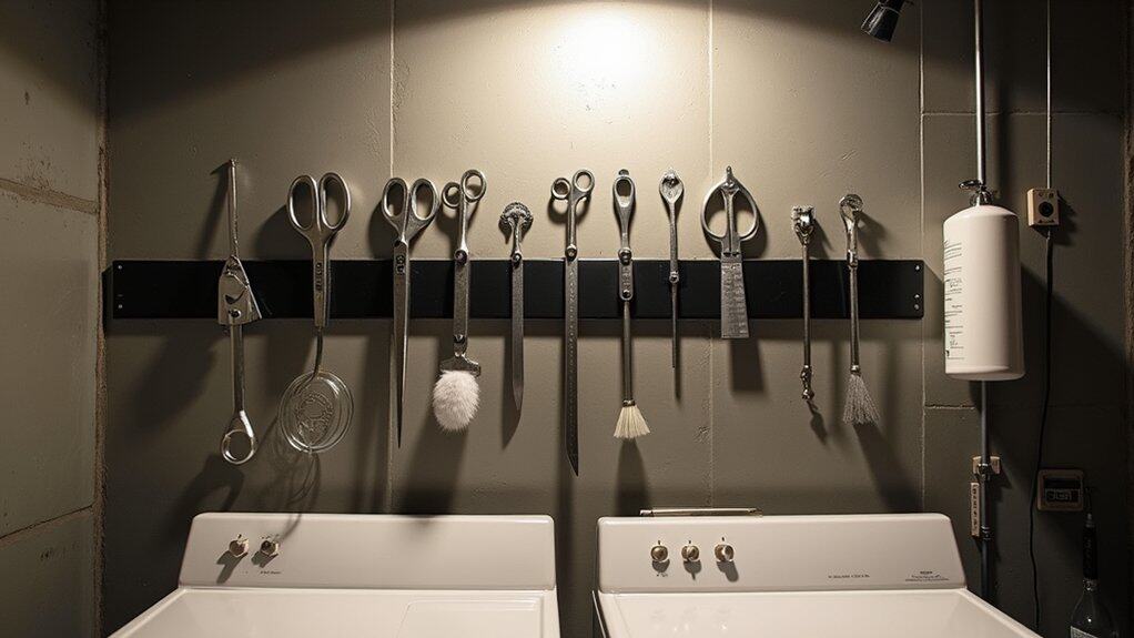 Magnetic tool holders are a fantastic solution for organizing small tools and accessories in a basement laundry room, especially when space is limited. These holders can be mounted on the wall or inside cabinet doors to keep items like scissors, measuring tapes, and spare hardware easily accessible yet out of the way. Choose a magnetic strip with a strong hold to guarantee heavier items don’t slip off, and position it near your workspace for maximum convenience.