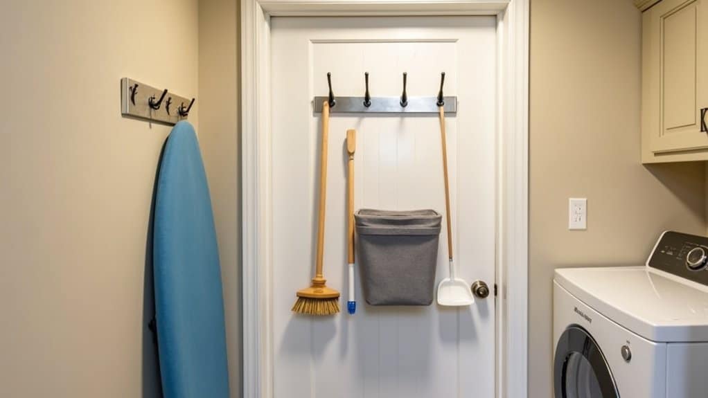 Over-door storage hooks are a fantastic solution for maximizing space in a basement laundry room where floor and shelf space may be limited. These hooks can be easily installed over the top of a door, providing a convenient spot to hang items like ironing boards, brooms, mops, or even laundry bags without taking up additional room. Choose hooks that are sturdy and adjustable to accommodate various door thicknesses and guarantee they can support the weight of the items you plan to hang.