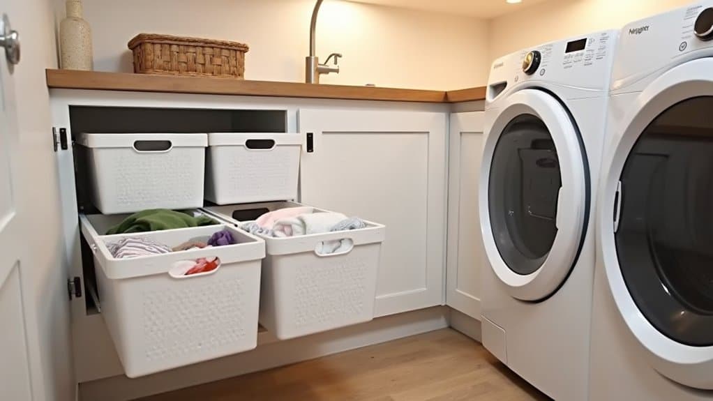 When organizing with pull-out hampers, consider using multiple units to separate whites, darks, and delicates right from the start. Label each hamper clearly to guarantee everyone in the household follows the system, preventing mix-ups. Opt for durable, easy-to-clean materials like mesh or plastic liners to keep the hampers fresh and maintain hygiene in your laundry space.
