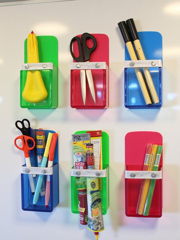 Magnetic detachable supply holders provide a space-saving storage solution by utilizing vertical surfaces in the classroom. Instead of taking up precious desk space, these holders can be mounted on metal surfaces like filing cabinets and whiteboards to create organized supply stations.