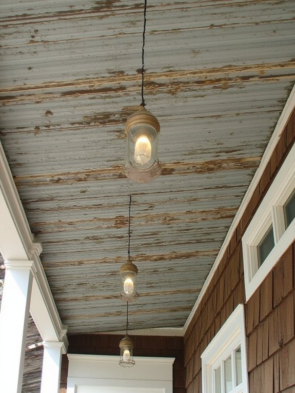Geometric tin panels transform porch ceilings with their striking repeating patterns and metallic finish. These durable panels create visual depth while reflecting natural light throughout the space, making the area brighter and more inviting.