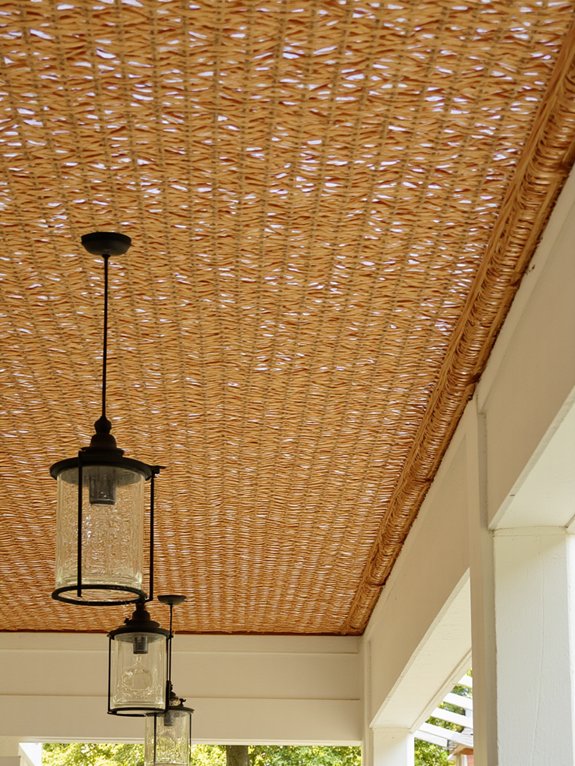 Woven rattan panels offer an elegant and practical ceiling solution, combining natural aesthetics with easy installation. The lightweight panels transform spaces through their intricate patterns, which create mesmerizing shadow play as sunlight filters through the weave throughout the day.