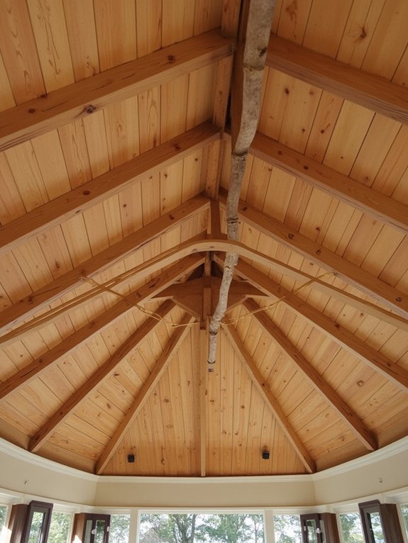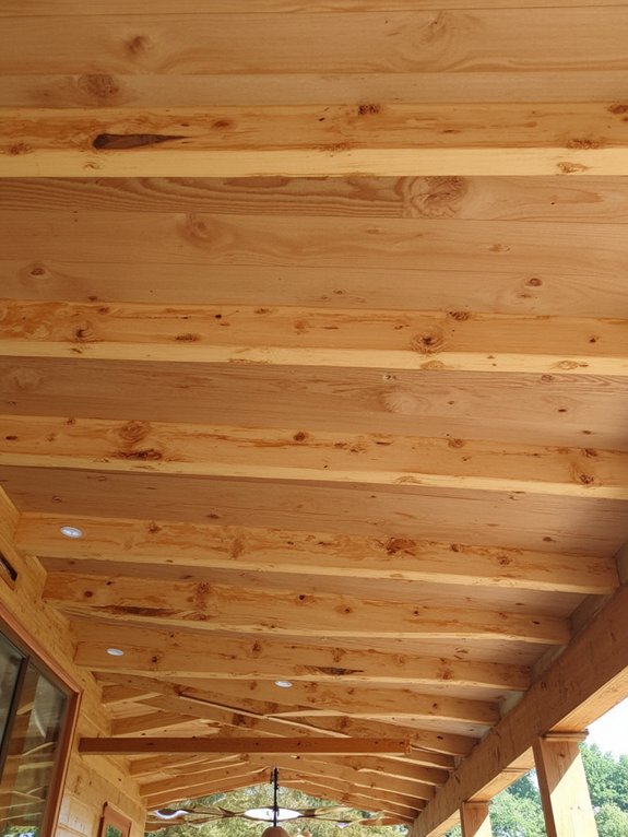 The design allows for customization through varied rafter spacing, which controls natural light and airflow. When combined with strategic lighting or wood stains, exposed rafters can create dramatic shadow play throughout the day while providing a warm, inviting atmosphere for evening gatherings. The result is a dynamic ceiling treatment that elevates the entire porch aesthetic.