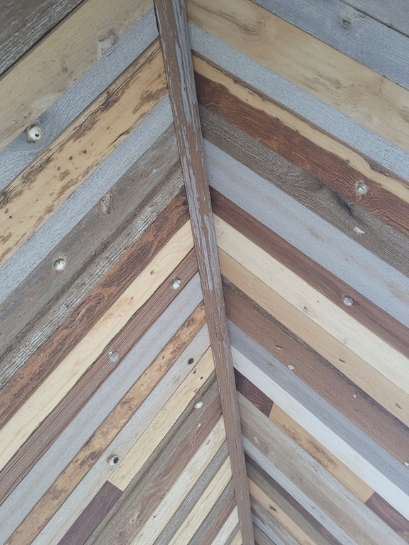 The distinctive angular design not only draws attention upward but also creates an illusion of expanded space. This pattern introduces dynamic movement and depth to the porch area, distinguishing it from conventional ceiling treatments while showcasing the natural beauty and history embedded in reclaimed wood.