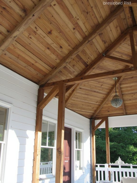 Exposed wooden rafters offer a striking architectural element that transforms ordinary porch ceilings into captivating design features. Instead of hiding structural components, these visible beams showcase the natural beauty of timber while adding depth and character to outdoor living spaces. The raw wooden elements create an authentic, rustic appeal that connects with traditional craftsmanship.
