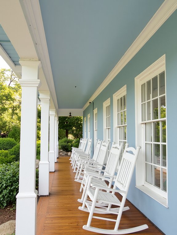 A painted sky blue ceiling on a porch creates an illusion of extended space while promoting a peaceful outdoor atmosphere. The classic blue hue mimics the natural sky, making the ceiling appear higher and more expansive than it actually is.