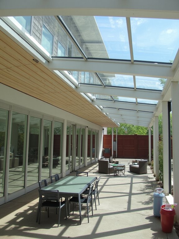 The design requires 1/2-inch tempered glass panels with UV protective coating, delivering multiple benefits including enhanced natural illumination, weather protection, and unobstructed sky views. This architectural choice creates an illusion of expanded space while preserving the comfort of a covered porch environment.