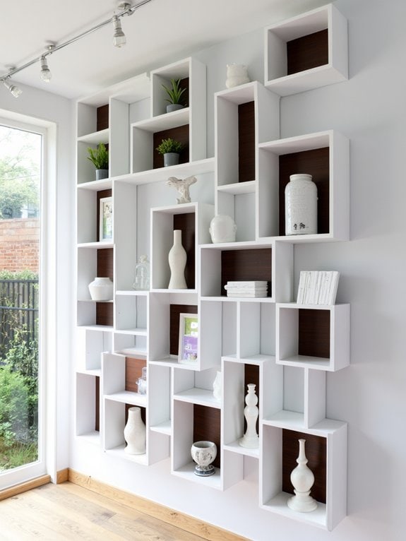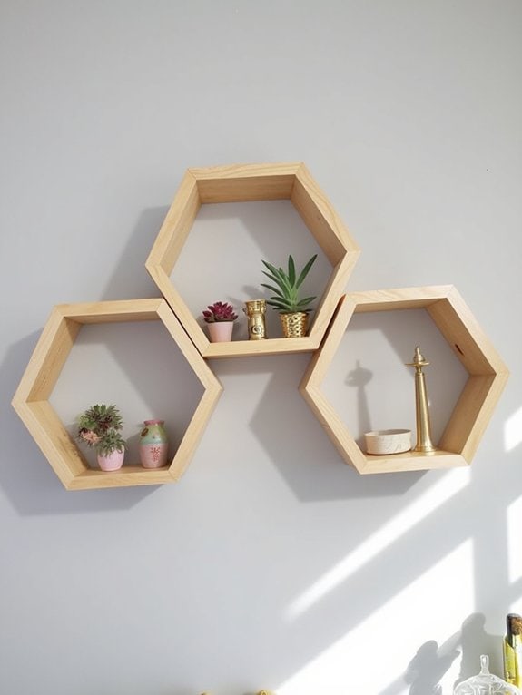 Geometric floating wood shelves combine modern design with practical storage by incorporating hexagonal, triangular, and angular shapes that create architectural interest on walls. These eye-catching shelves serve as both functional storage solutions and striking decorative elements.