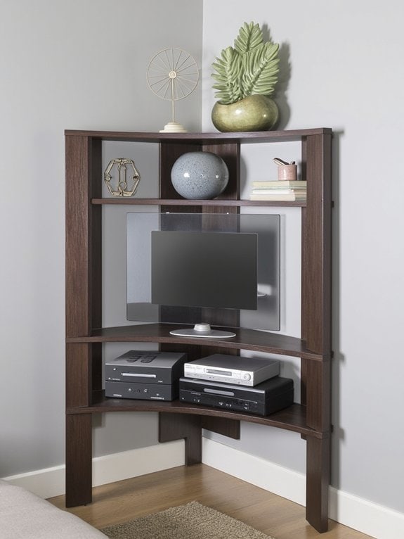 Corner entertainment media shelves transform unused corner spaces into functional storage areas for TVs and electronic components. These angled units maximize room layout efficiency while providing an attractive display solution.