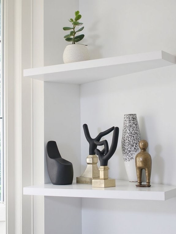 The key to creating an impactful gallery wall lies in thoughtful arrangement. Mount shelves at different heights, maintaining 12-16 inch vertical spacing, and organize items using the rule of thirds. Layering smaller pieces in front of larger artwork adds visual depth, making these versatile shelves perfect for living rooms and hallways.