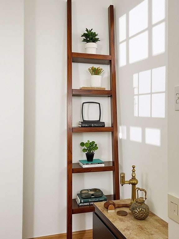 Ladder-style bookcases combine functional storage with contemporary design through their distinctive angled silhouette. The progressive shelving depth, starting wider at the base and becoming shallower toward the top, creates an eye-catching display while efficiently utilizing vertical wall space.