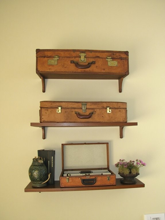 Turn ordinary vintage suitcases into eye-catching wall displays by mounting them as unique shelving units. These repurposed cases create instant character while providing practical storage space for treasured items and collectibles.