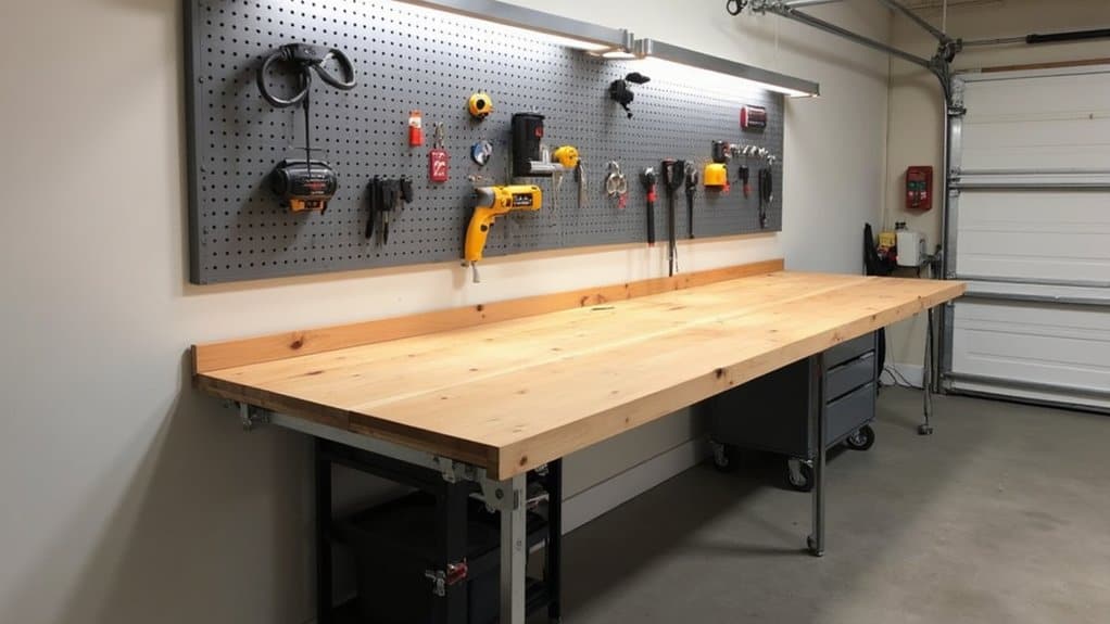 A foldable workbench is an excellent addition to a two-car garage, offering a versatile workspace that can be easily tucked away when not in use. Choose a sturdy, wall-mounted foldable workbench that can support heavy tools and materials, guaranteeing it locks securely in place when opened. Position it on a wall near an electrical outlet if power tools are frequently used, and make sure the area around it is clear for safe operation.