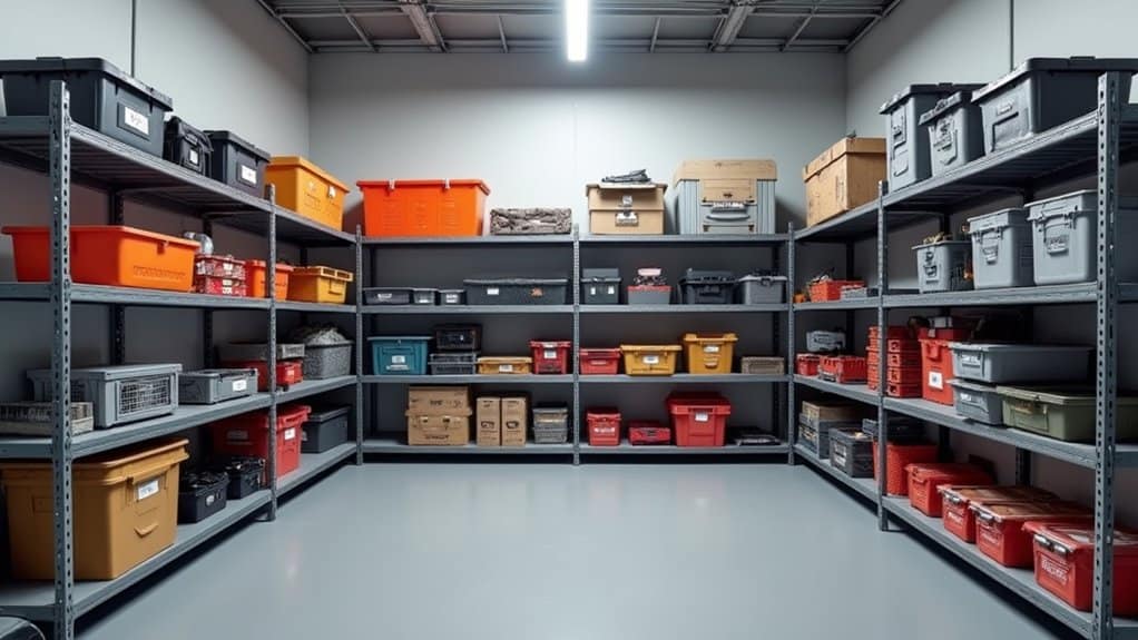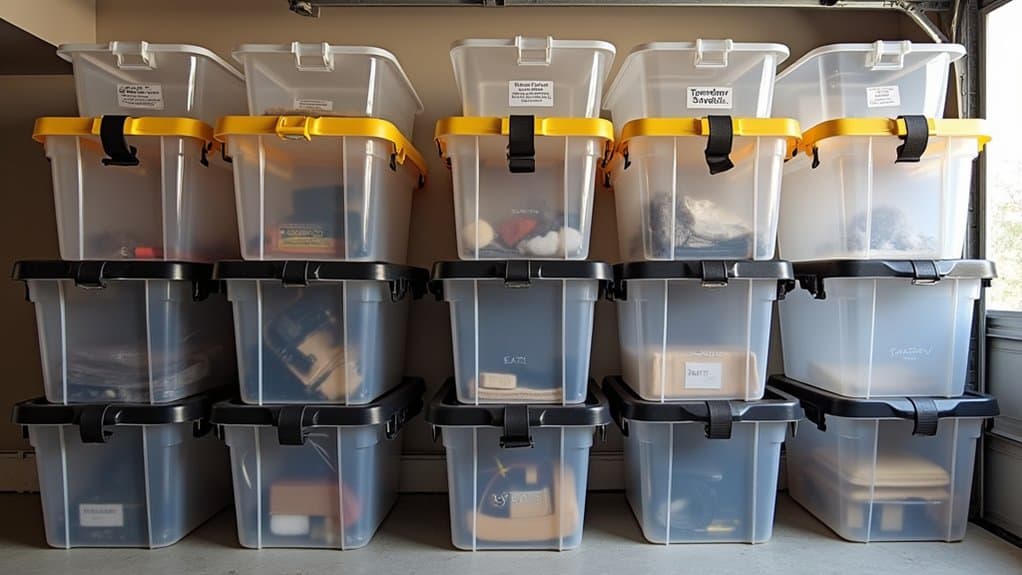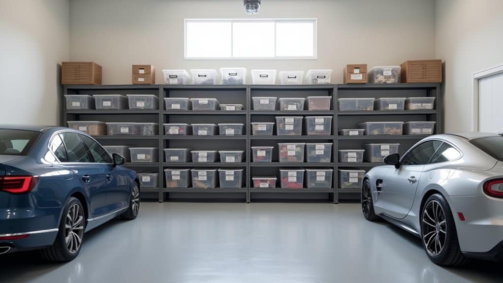 Stackable storage bins are an excellent solution for maximizing vertical space in a two-car garage, keeping items off the floor and organized. Start by selecting durable, transparent bins so you can easily see the contents without opening each one, and opt for uniform sizes to guarantee they stack securely. Label each bin clearly with categories like seasonal decorations, tools, or car care supplies to quickly locate what you need.