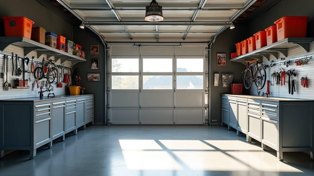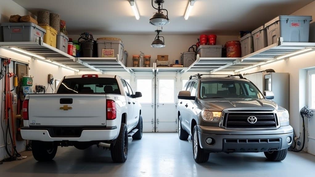 Hey, let’s chat about turning your two-car garage into a space-saving haven! I’ve tinkered with mine, and trust me, it’s a game-changer. Start by eyeing those bare walls—think vertical! Install wall shelves about 6 feet up for bins and gear. It’s simple: grab a drill, mark your spots, and secure ‘em. Curious how much more you can fit? Stick with me for some clever tricks!