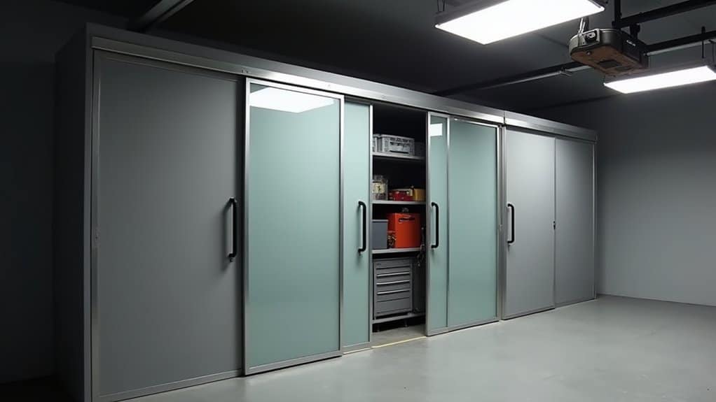Installing sliding cabinet doors in a two-car garage is a practical way to maximize storage while keeping the space tidy and accessible. Begin by measuring the dimensions of your cabinets or storage areas to guarantee the sliding doors fit properly, accounting for the track system’s depth and clearance. Choose materials like lightweight wood, metal, or even frosted glass for a modern look that matches your garage’s aesthetic.