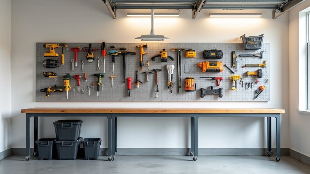 A pegboard organization system is an incredibly versatile and space-saving solution for a two-car garage, allowing you to customize storage for tools, equipment, and other items. Start by selecting a sturdy pegboard panel, ideally made of metal or heavy-duty fiberboard, and mount it securely to a wall using furring strips or a frame to guarantee it can hold weight. Measure the space carefully to maximize coverage and verify the board is at a comfortable height for easy access to frequently used items.