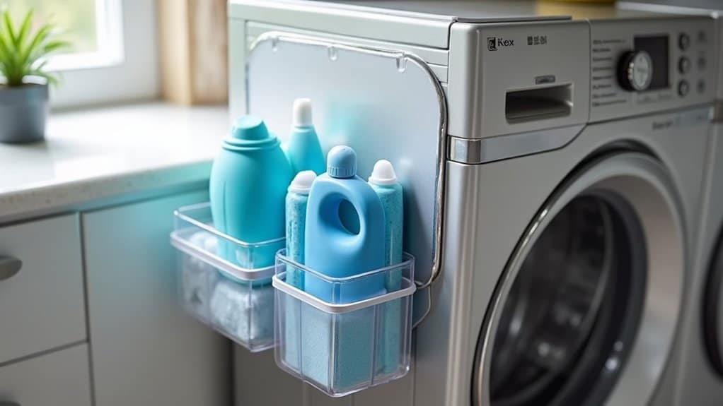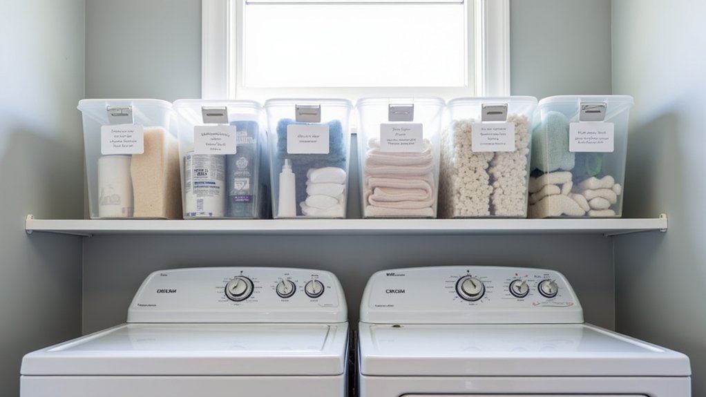 To maximize their effectiveness, use clear bins or add labels with bold, legible text to quickly identify contents without rummaging. Group similar items together, such as cleaning supplies in one bin and fabric care products in another, to streamline your laundry routine. This simple system prevents clutter and makes restocking supplies a breeze.