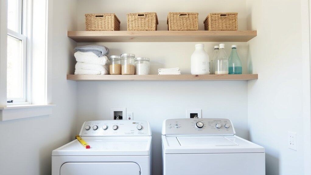 Mounting wall shelves in a rental laundry room is an excellent way to maximize vertical space and keep essentials within reach without cluttering the floor. Start by choosing lightweight, easy-to-install shelves that adhere to rental agreements, such as those with adhesive mounts or tension rods that don’t require drilling. Verify the shelves are placed at a convenient height for frequently used items like detergent, dryer sheets, and cleaning supplies, while keeping safety in mind to avoid overloading them with heavy objects.