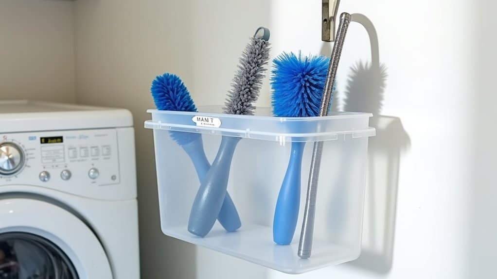 For added efficiency, label the container or individual tools to avoid confusion, especially in shared spaces where multiple renters might use the laundry room. Regularly check and clean these tools after each use to maintain their effectiveness and prevent lint buildup on them. This simple system not only keeps the area tidy but also promotes dryer safety by guaranteeing lint removal tools are always ready for use.