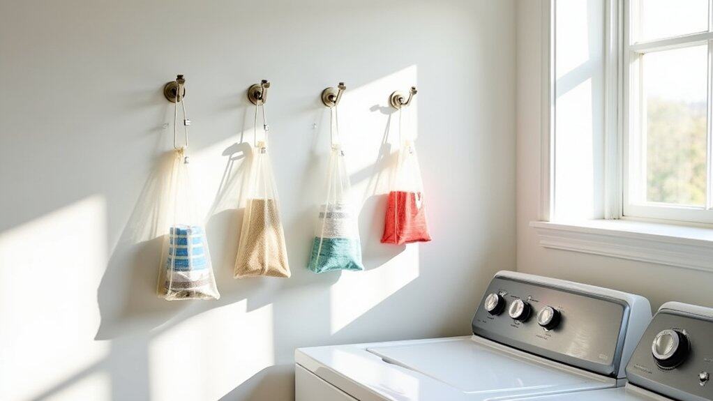 To set up, first identify an unused wall or door space near the washer and dryer where the bags won’t obstruct movement or appliance access. Attach removable adhesive hooks or an over-the-door organizer to hang the mesh bags securely, ensuring they are within reach but not in the way of laundry tasks. Label each bag if needed, categorizing items like stain removers or delicates wash bags to streamline your laundry routine efficiently.