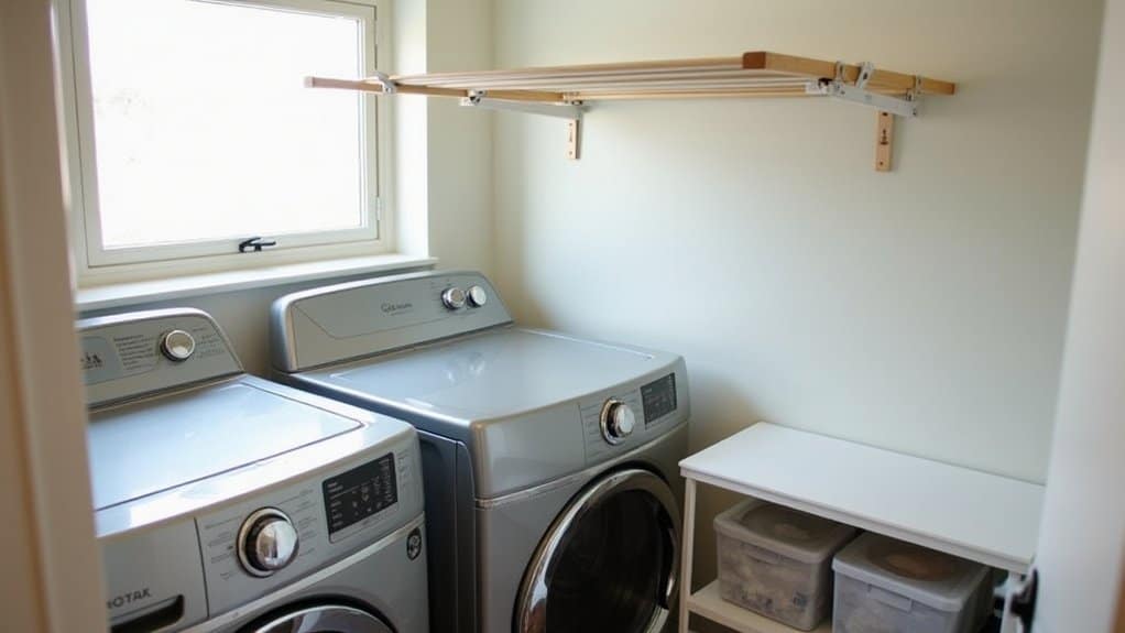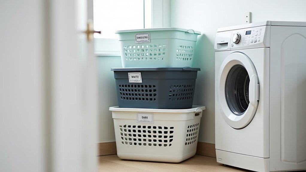 Stackable laundry baskets are an excellent solution for maximizing space in a rental laundry room, especially when floor space is limited. These baskets can be vertically arranged, allowing you to sort clothes by color, fabric type, or family member without cluttering the area. Choose lightweight, durable baskets with handles for easy transport and guarantee they fit neatly in a designated corner or on a shelf.