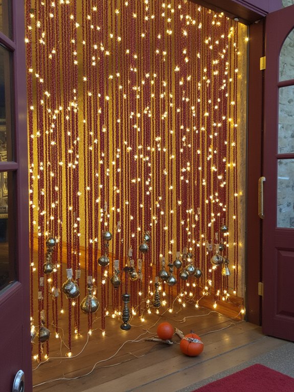 Modern beaded door curtains blend natural materials like wooden beads, shells, and crystals to create enchanting entryways with a bohemian holiday flair. These decorative pieces transform traditional 1960s-style curtains into contemporary seasonal statements by incorporating festive elements like bells, crystal prisms, and dried botanicals.