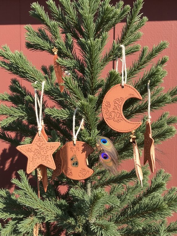 These handcrafted pieces require soft leather treated with natural oils, brass findings, and secure assembly using leather cord or metallic thread. The resulting ornaments add organic texture and earthy charm to holiday decorations while showcasing artisanal craftsmanship in a modern bohemian style.