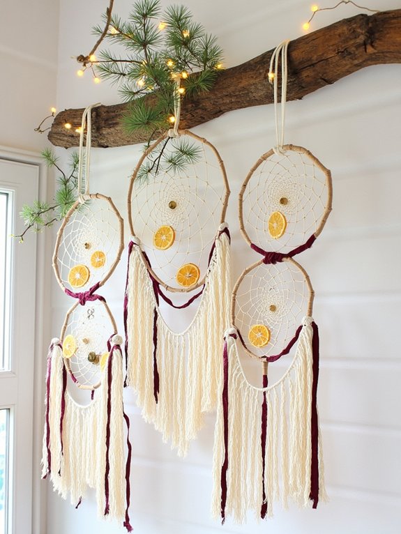 Traditional dream catchers take on new life as enchanting holiday decor pieces in this bohemian-inspired display. By weaving metallic threads and ribbons through natural fiber hoops and incorporating seasonal elements like pine sprigs and dried orange slices, these pieces transform into festive wall art.