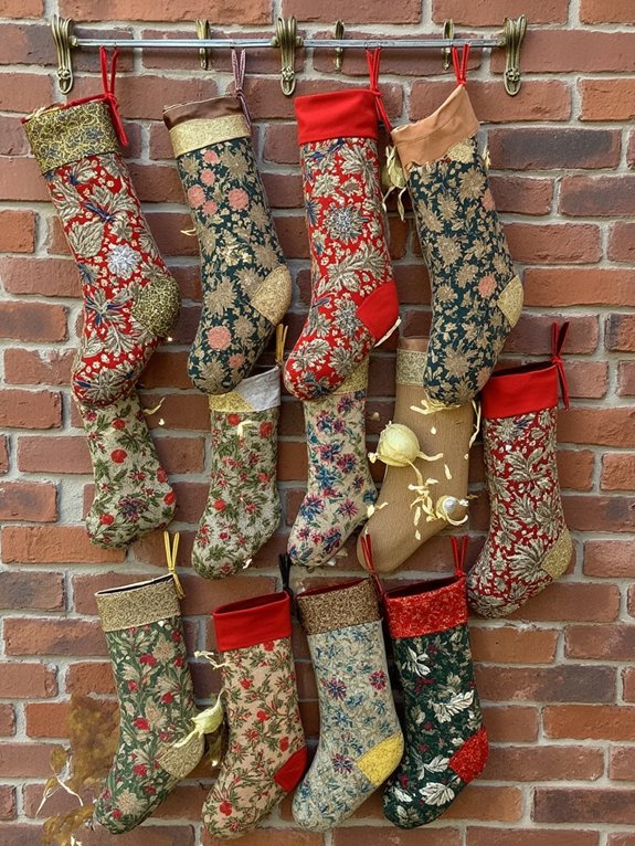 Vintage tapestry stockings offer a distinctive holiday decorating approach, combining traditional charm with bohemian style. These unique pieces feature intricate embroidery, velvet patches, and woven designs that create visual depth and character when displayed on mantels or walls.