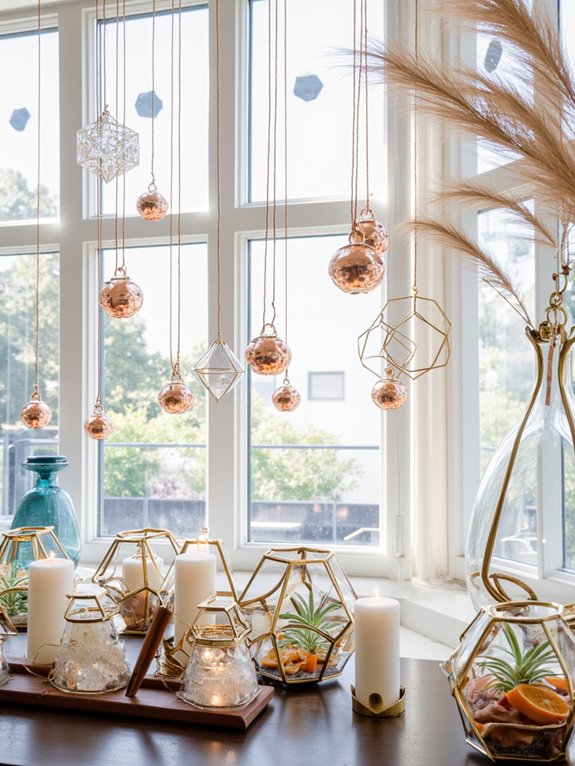 Geometric crystal window displays combine prisms and geometric shapes to create enchanting light effects in windows. When sunlight passes through strategically placed crystals and clear beads arranged in patterns like triangles and hexagons, it casts rainbow reflections throughout interior spaces, transforming ordinary windows into striking focal points.