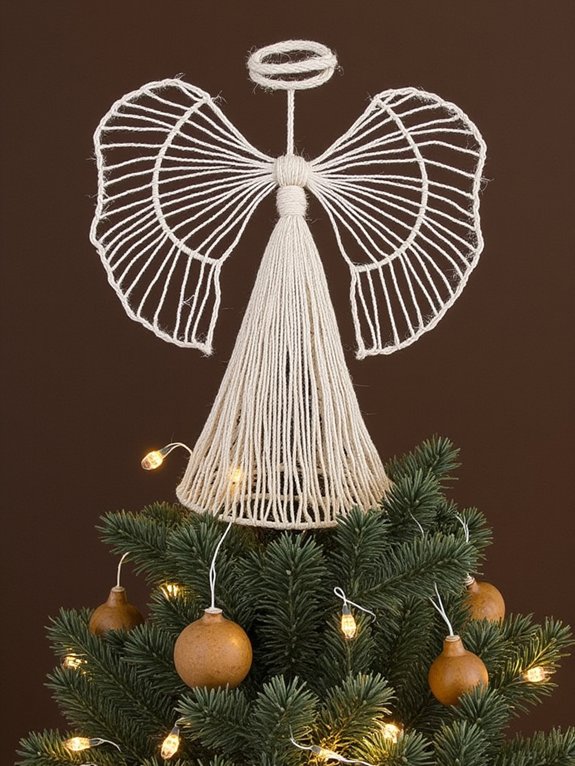 A woven hemp angel topper offers a bohemian alternative to traditional metallic or crystal tree toppers. Standing 8-10 inches tall, this lightweight decoration features natural hemp cord woven into a delicate angel form, creating an organic, handcrafted appearance that adds rustic charm to Christmas trees.